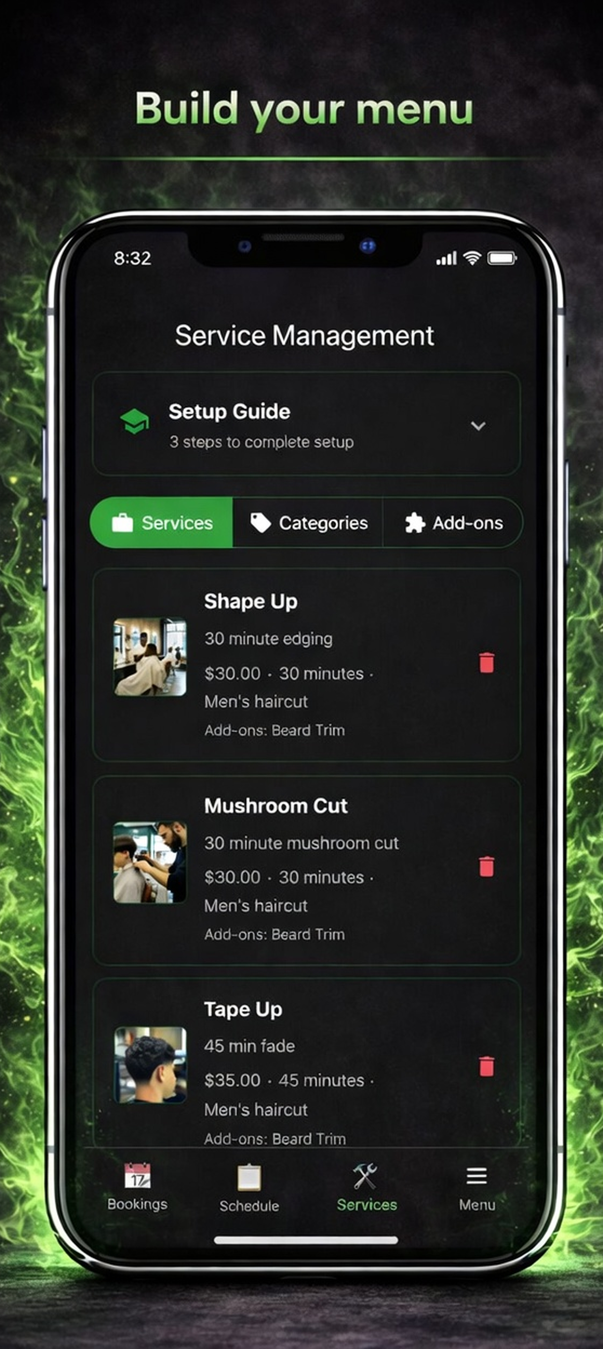 Create unlimited services and add-ons. Let clients customize their appointments with extras like deep conditioning, beard trim, or design work. Increase your average ticket without extra effort.